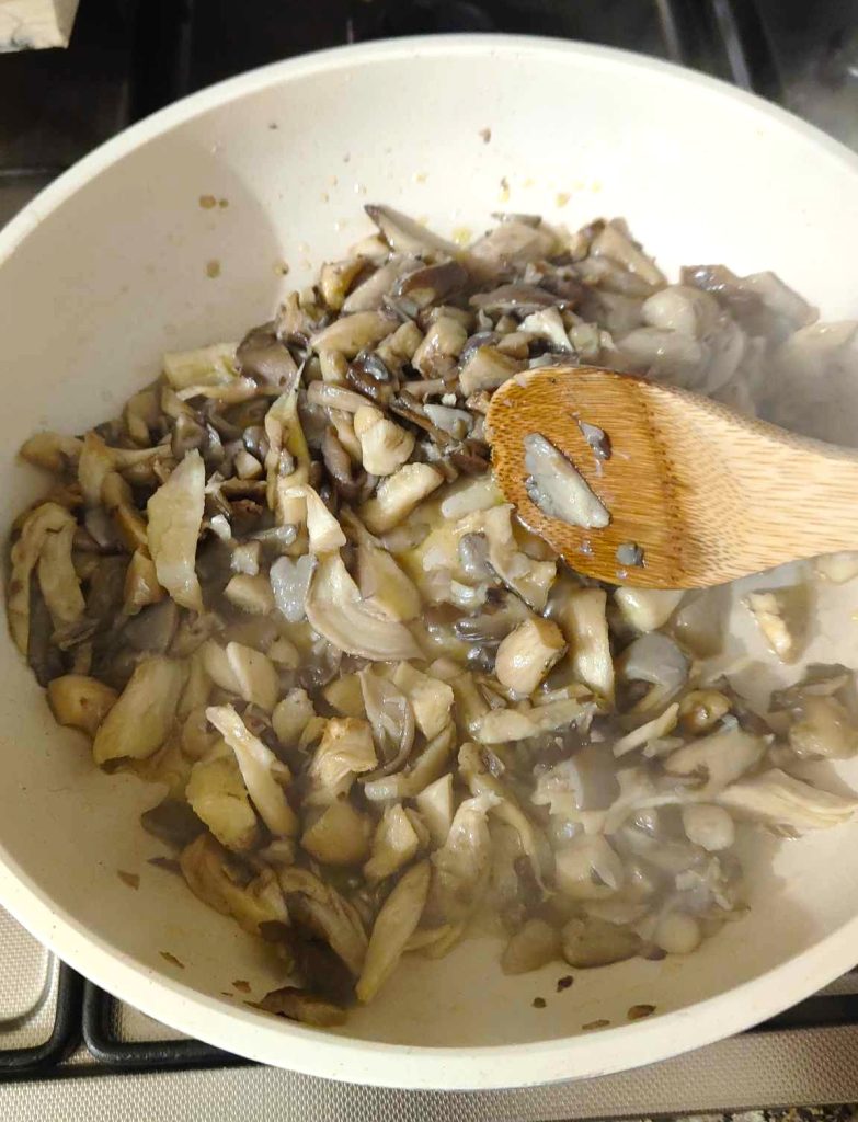Clean the Pleurotus mushrooms and cut them into strips, then sauté them in a pan with oil for about 10 minutes, the time to cook and soften them a bit. The recipe weight refers to the already cooked mushrooms.