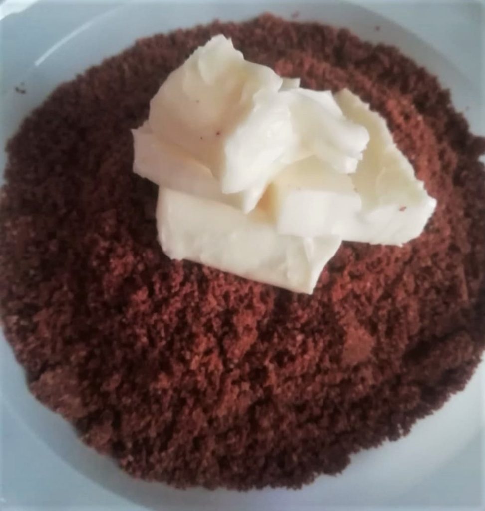 • Finely blend the cocoa biscuits with a mixer. Then add the softened butter and knead the mixture with your hands.