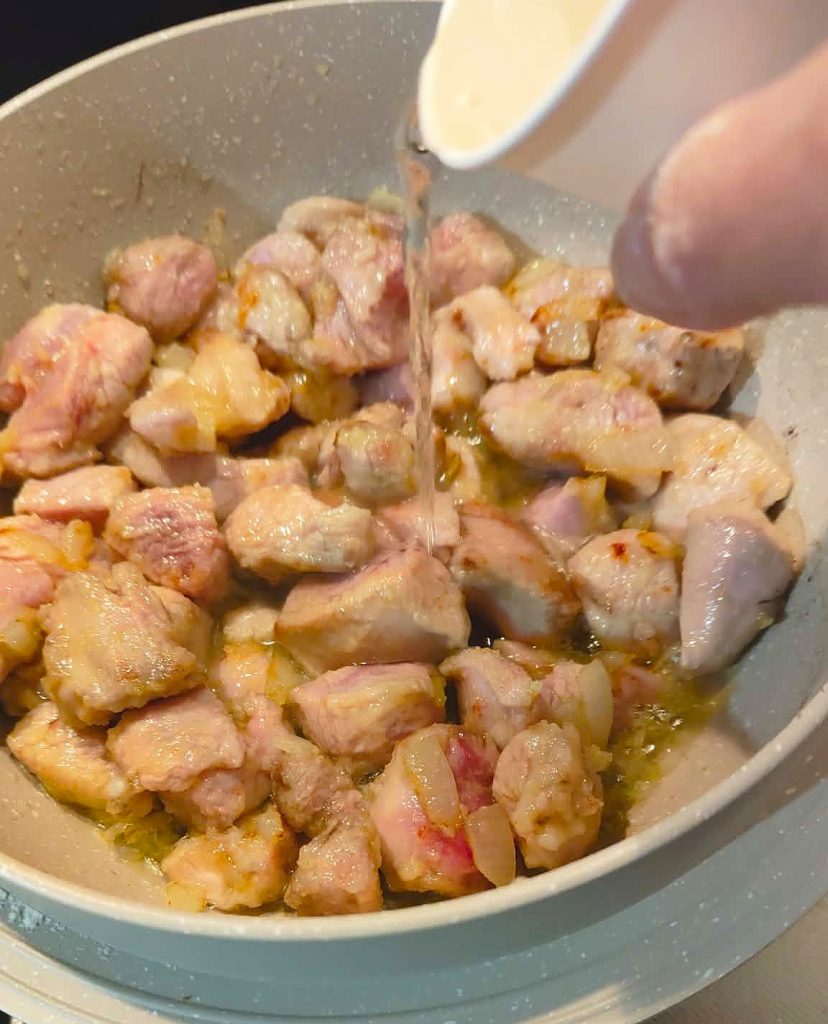 5 – At this point, pour the white wine over the meat, turn the heat up slightly, and let it cook off for a few minutes. In the meantime, stir the bites in the pan.