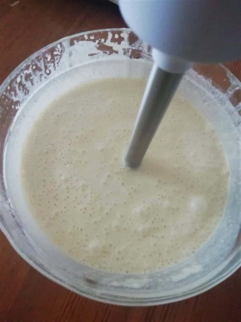 Pour the flour into the milk, a little at a time, and beat the batter with the whisk to eliminate any lumps that may form. To obtain a lump-free batter, I recommend immersing the stick of a hand blender into the bowl and blending the ingredients, so you will have a smooth and velvety batter.