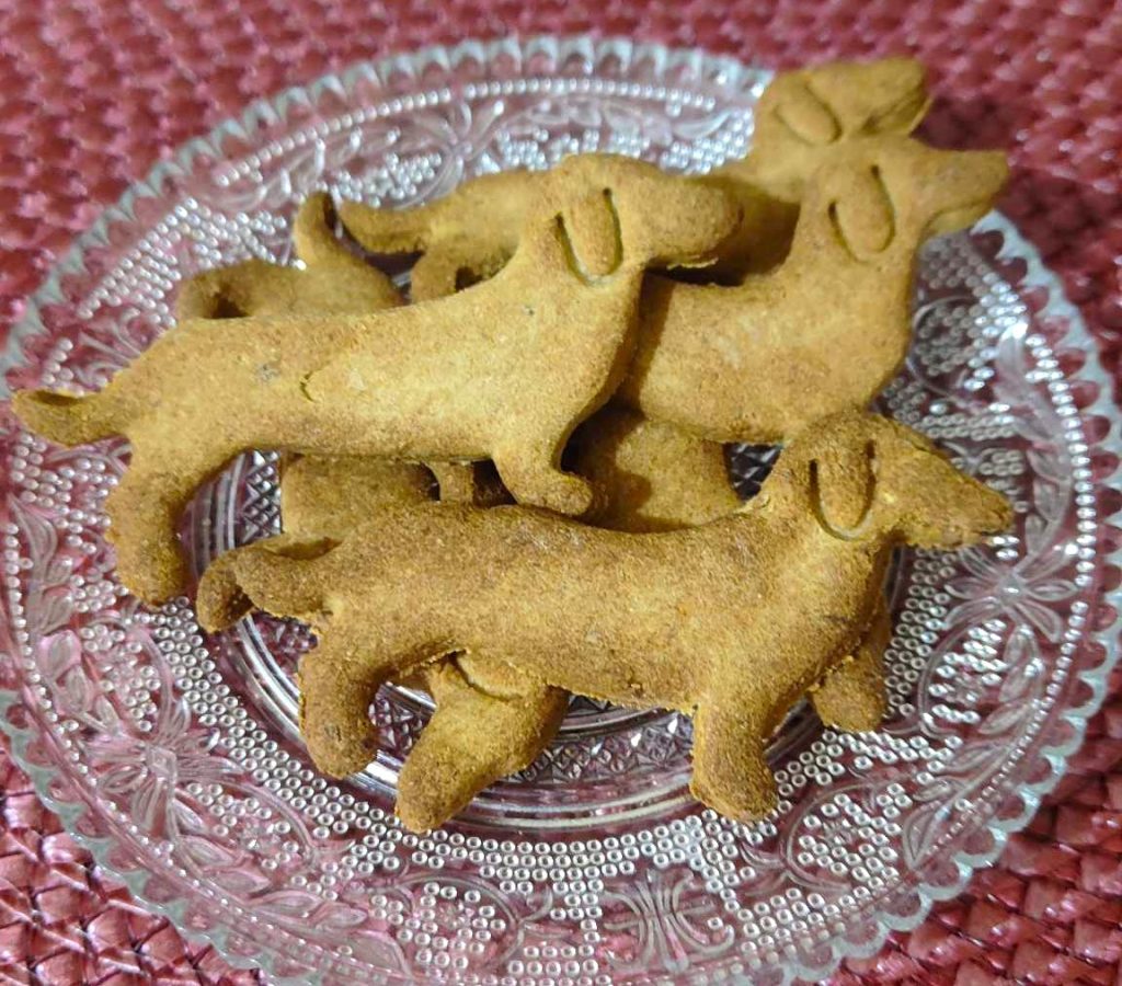 Using a cookie cutter (in the shape you like, I used the little dachshund one linked above in the recipe introduction), cut out the biscuits and place them on the baking tray to bake at 320°F for about 25-40 minutes, until fully cooked depending on the thickness you’ve made. When they are dry and crunchy, they are ready.