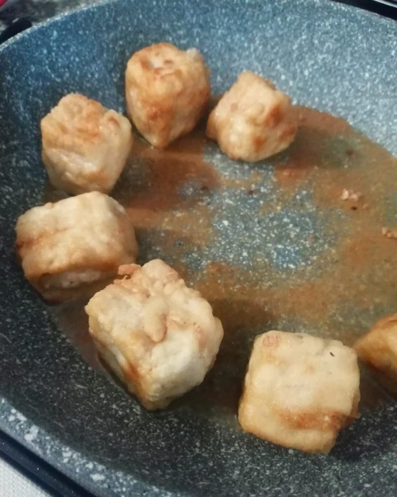 Pay attention to the drying and breading times of the tofu; the flour-coated tofu cubes must be fried immediately, otherwise, the water’s moisture will return to the surface.