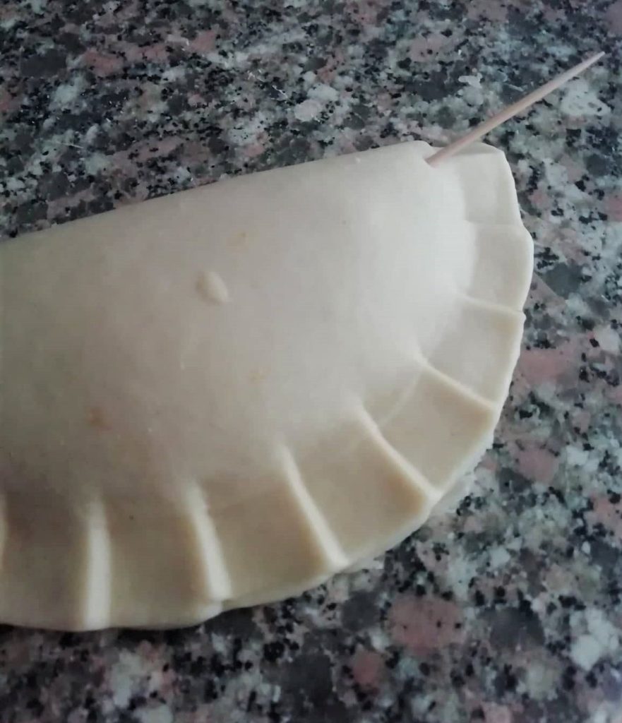 At this point, use a toothpick to make a small hole at both ends to release excess trapped air. Then place the prepared half-moons on a floured tray.