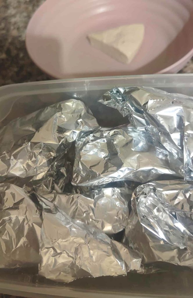 Wrap each cheese wedge individually in a small square of aluminum foil or plastic wrap.