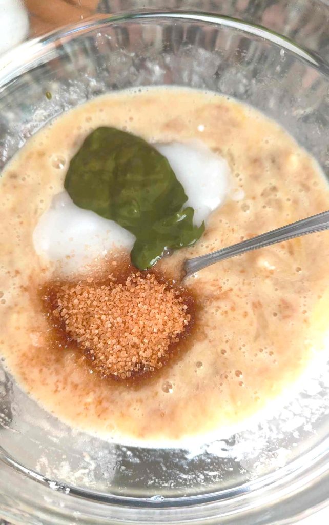1 – Prepare the wet ingredients: In a large bowl, mash the ripe bananas with a fork, add the eggs, coconut oil, Matcha green tea diluted with water, brown sugar, and a pinch of salt. Mix well until creamy and smooth.