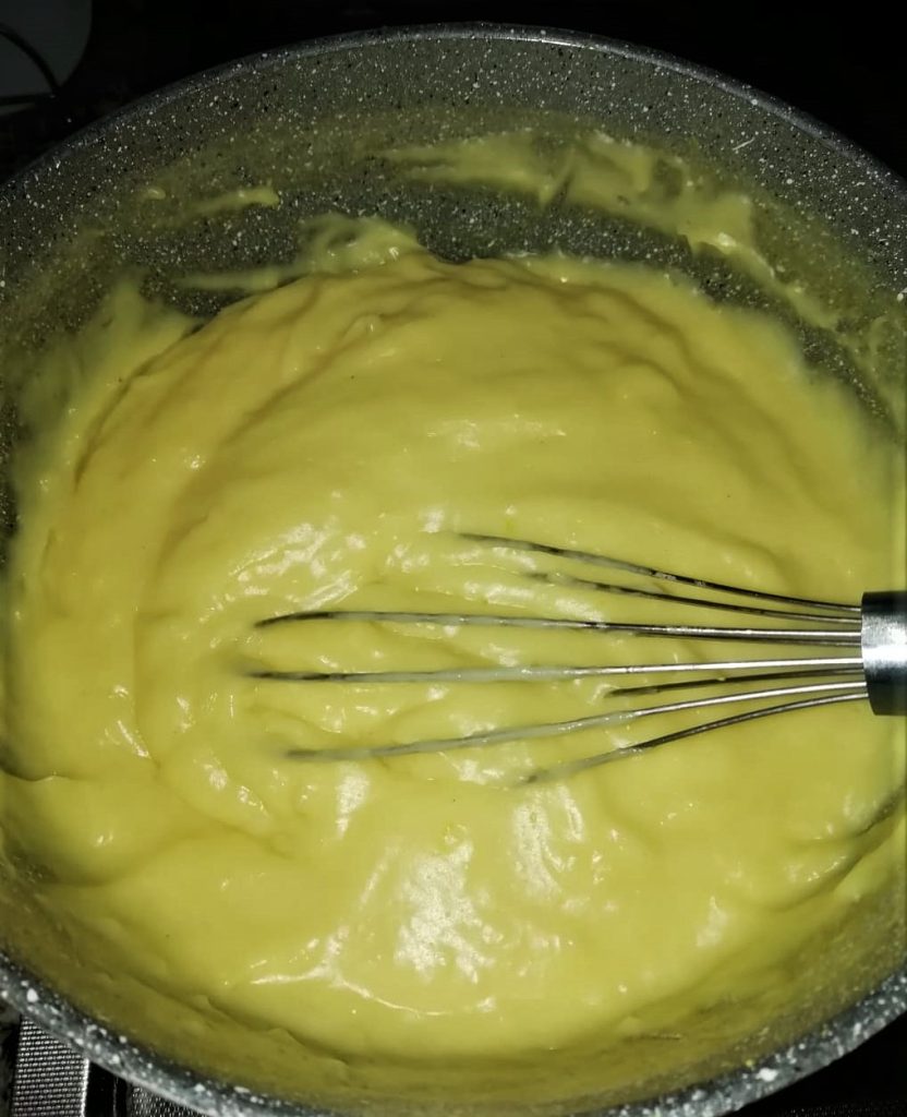 • In the meantime make the milk custard by placing the beaten eggs with the sugar in a small pot, then add the flour little by little and finally add the milk in small amounts. Mix the mixture well with a whisk, grate in the lemon zest and put the pot on the heat. Cook the milk custard over low heat until it becomes thick.