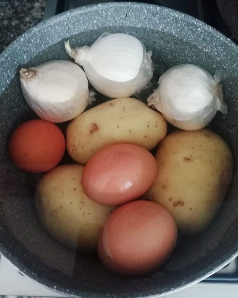 There is nothing easier than putting all the ingredients in a pot of water: the potatoes with their skins on, the whole onions also with their skins on, and the raw eggs.