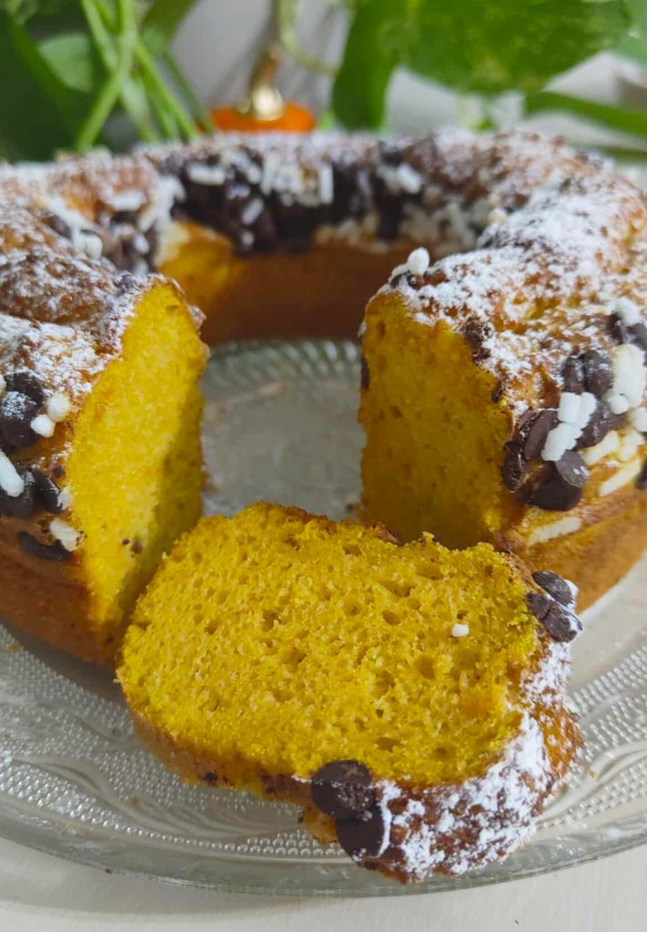 It’s really simple to prepare: just cook and puree the pumpkin, add it to the batter, and pour everything into the mold. Before baking, add plenty of dark chocolate chips and sugar sprinkles on top, which will create a delicious topping when baked.