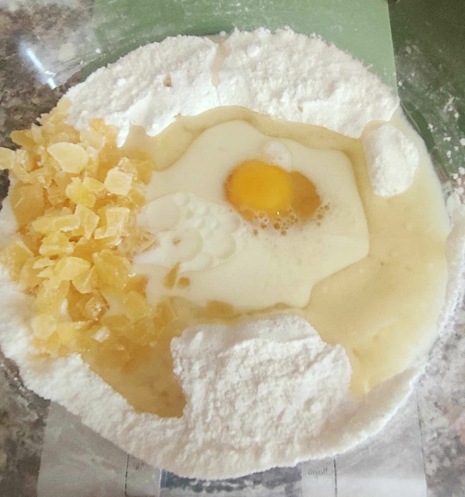 Mix the powders well together, then add the liquid ingredients: oil, milk, the whole egg, and the dried pineapple cut into small pieces. Then, with a fork, mix the batter well to combine the ingredients.