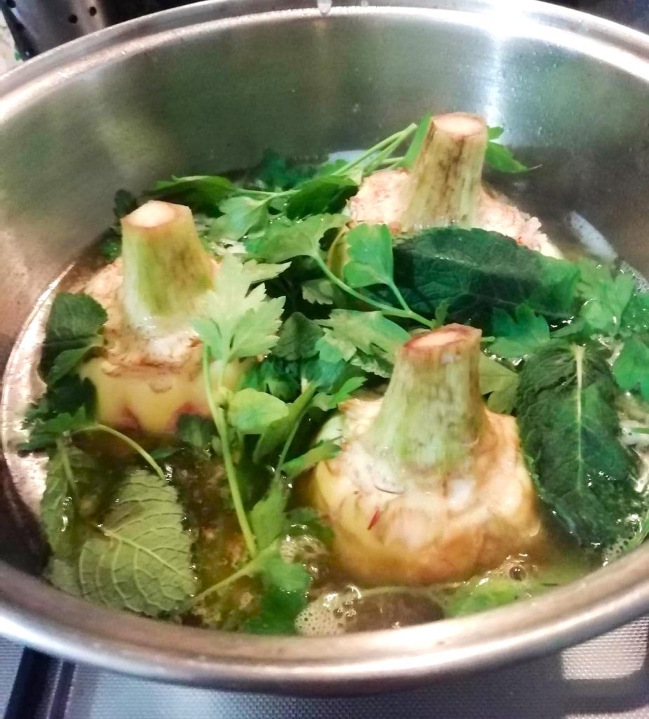 Place the artichokes in the saucepan, side by side with the stem up, and place the trimmed stems between them. Add a generous bunch of fresh parsley and a handful of mint leaves on top. A final sprinkle of salt and white pepper.