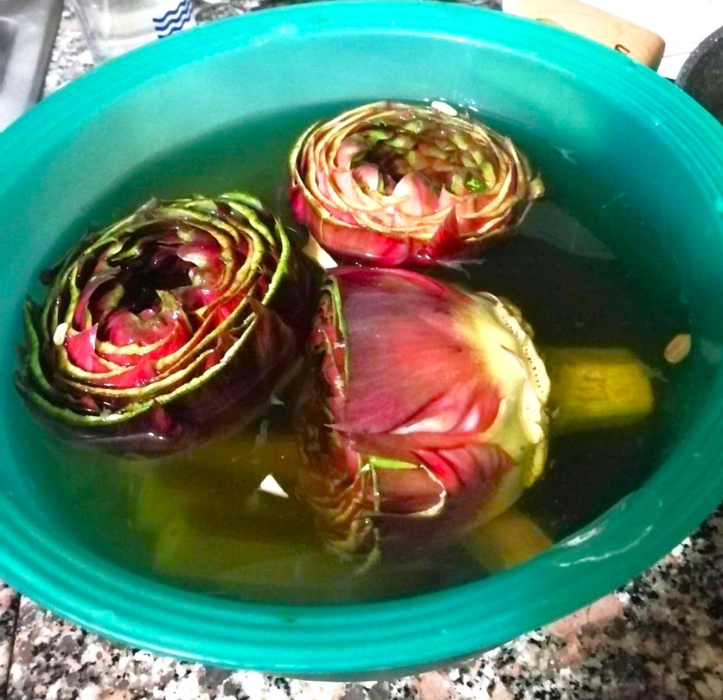 Open the leaves of the artichoke, gently tapping it on the work surface and submerge it in the bowl with the water and lemon, to prevent it from darkening during preparation. The stems also need to be trimmed to the more tender heart and submerged in the acidic water.