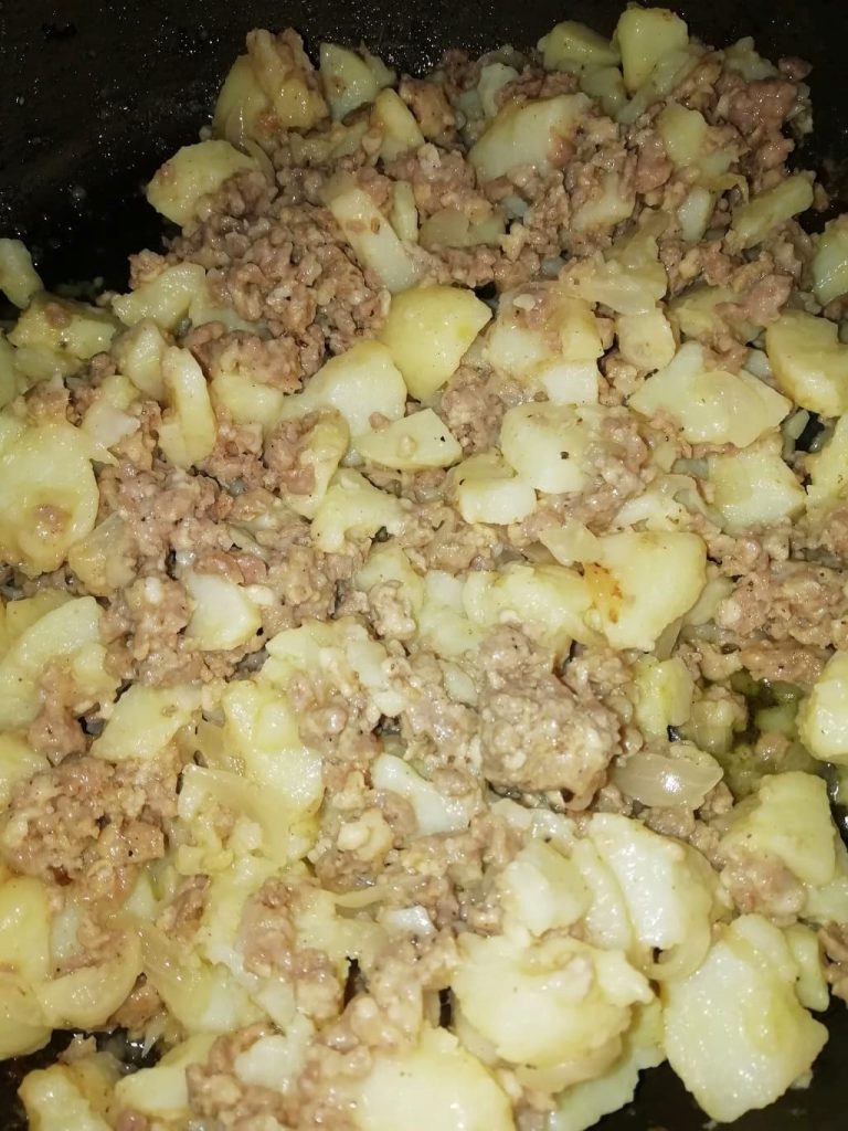 Meanwhile prepare the filling by boiling the potatoes with their skins. When cooked, peel them, dice them and sauté them in a pan with a drizzle of olive oil, a pinch of salt and the finely chopped onion.