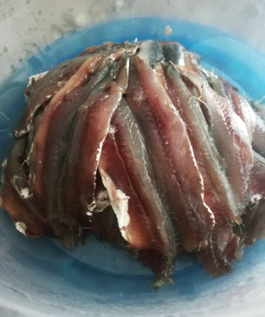 Clean the sardines one by one, gutting them, then remove the head and pull out the spine.