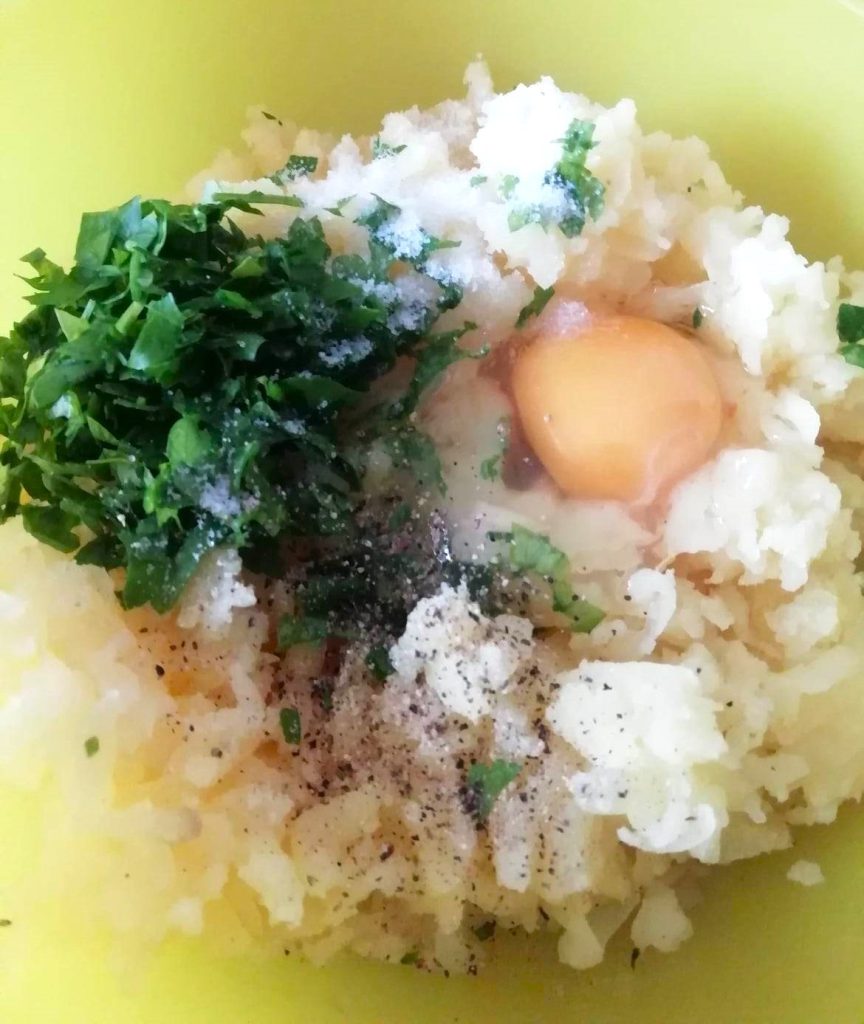 In a bowl, put the mashed potatoes, egg, grated Parmesan cheese, minced or crushed garlic, fresh chopped parsley, salt, and a sprinkle of ground black pepper. If you see that the potato mixture is too moist, you can add 1 tablespoon of breadcrumbs to firm it up a bit. Mix the mixture well, taste it, and adjust the salt to your liking.