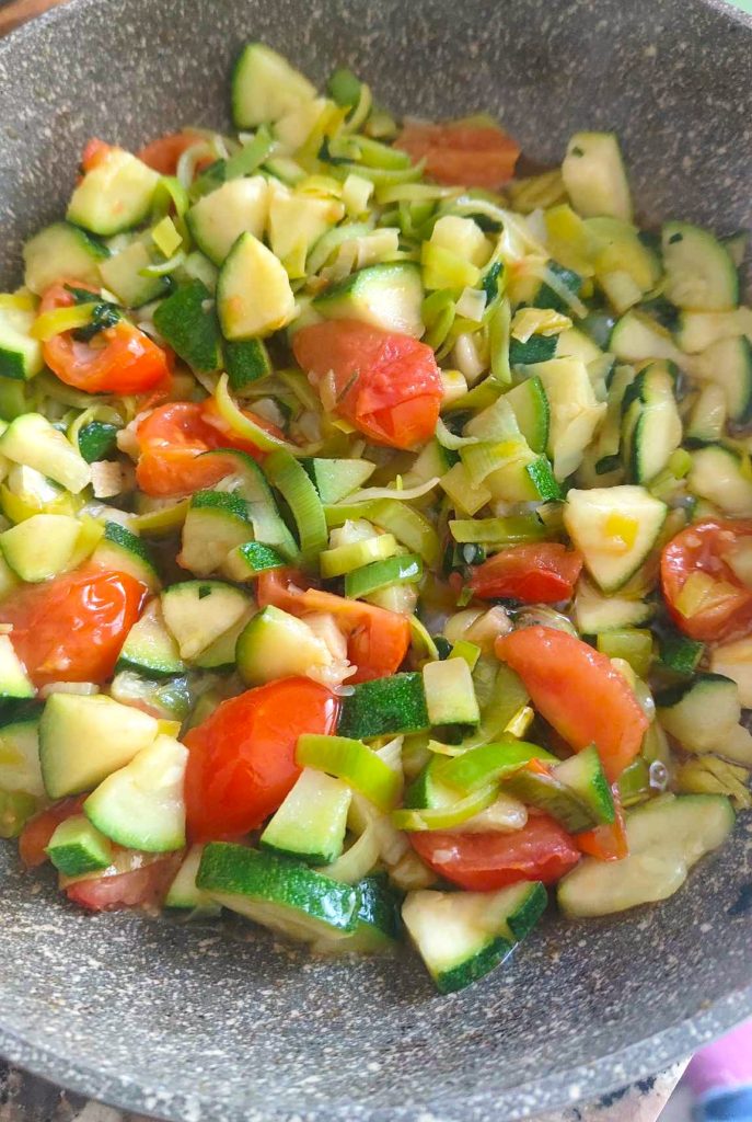 Start the rustic pie by dicing the zucchini into small cubes, slicing the leek finely, and cutting the cherry tomatoes into 4. Put the vegetables in a non-stick pan with 4 tablespoons of oil, half a clove of garlic, and the chopped parsley.