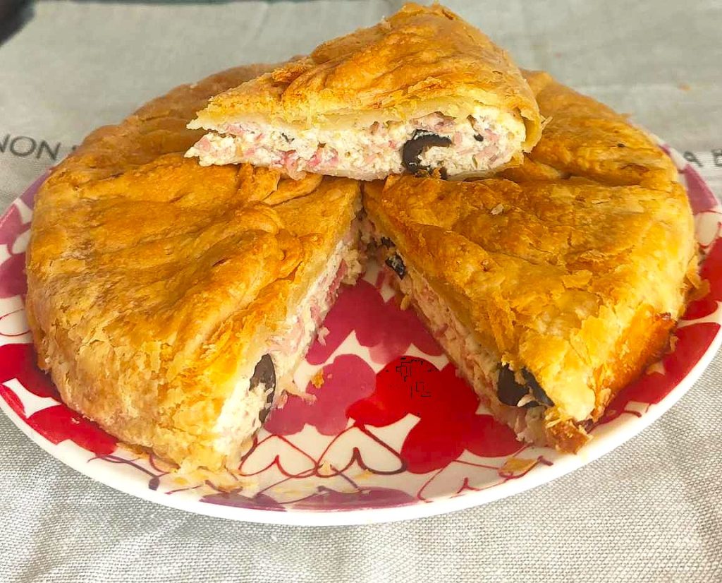 Crunchy on the outside and soft on the inside, this savory pie is a true triumph of flavors and simplicity. Made with a ready-made puff pastry base, it’s filled with a tasty mix of fresh cheese, cooked ham, and black olives, for a perfect contrast between creaminess and savoriness.