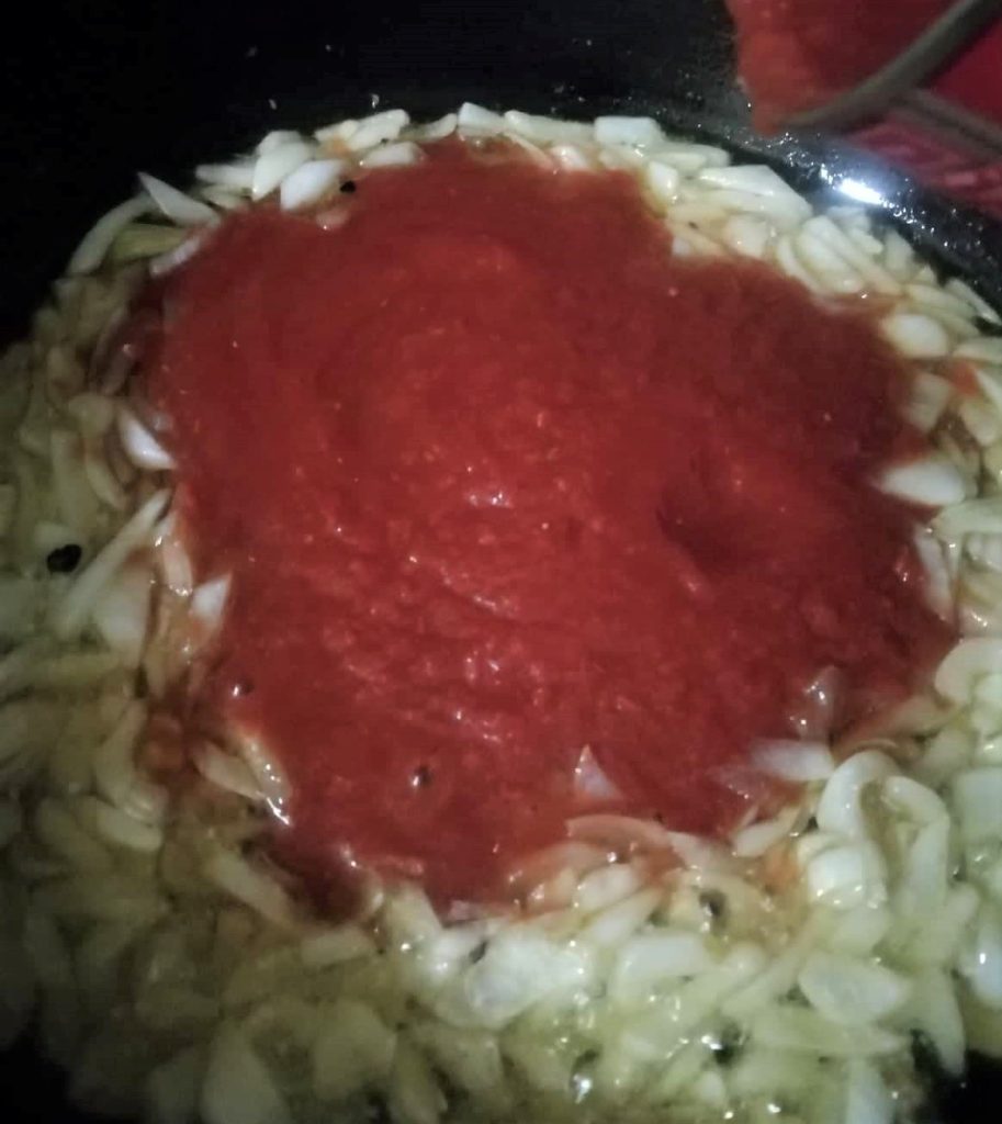 In the same pan where you fried the vegetables, add the olive oil and the finely sliced onion. Let it sauté and slightly brown.