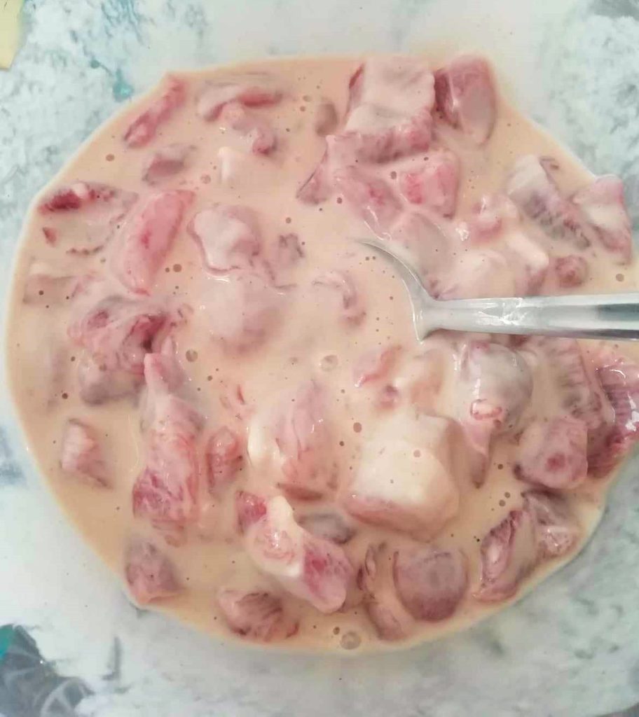After the marinating time has passed and the batter has rested, pour the batter into the bowl with the meat and mix all the ingredients well to combine them.