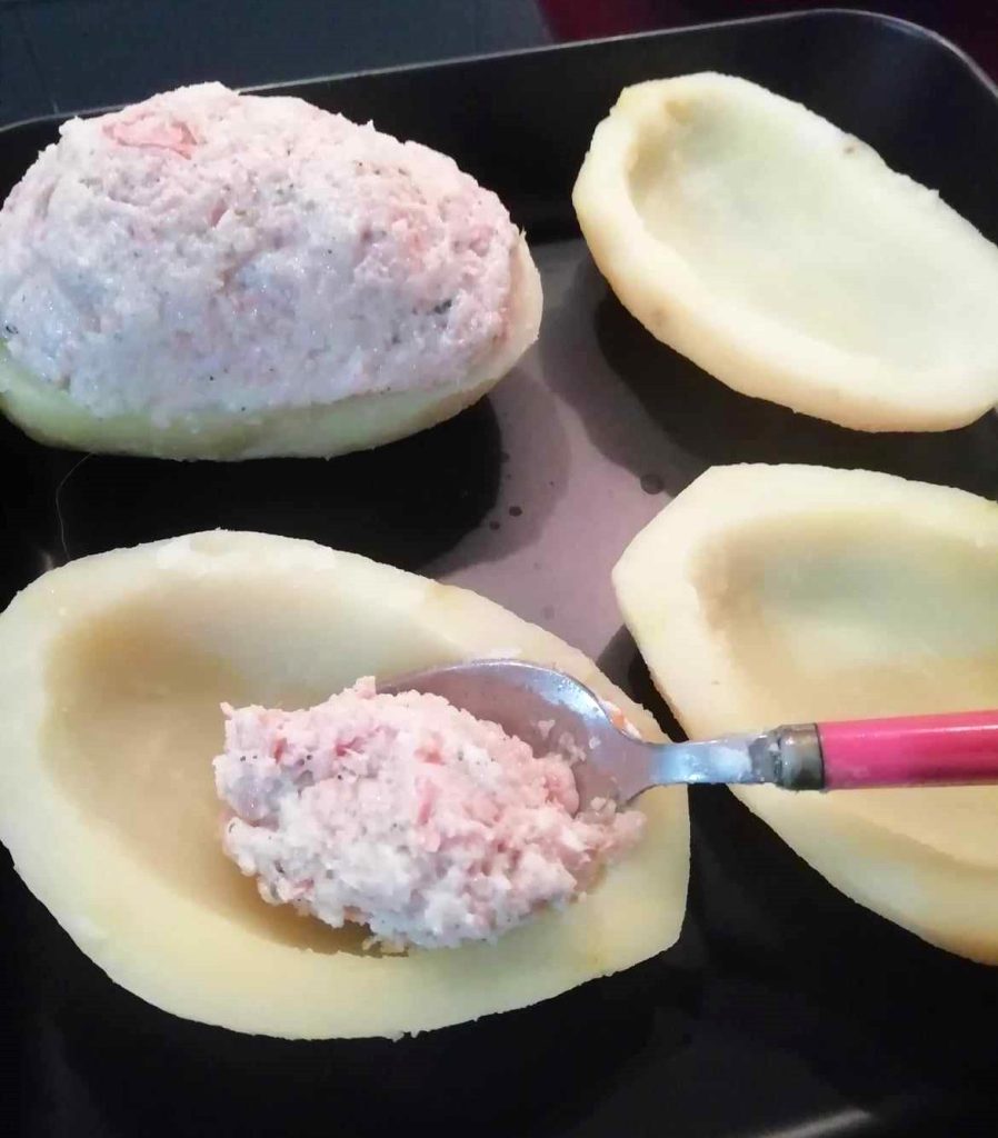 Prepare the baking tray and fill the potato halves with the filling. Generously fill them with a teaspoon.