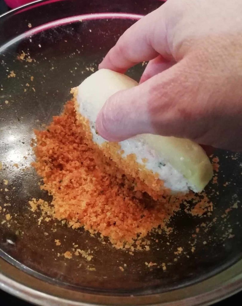 Roll the stuffed potatoes in the breadcrumbs, one by one, to make the breading adhere.