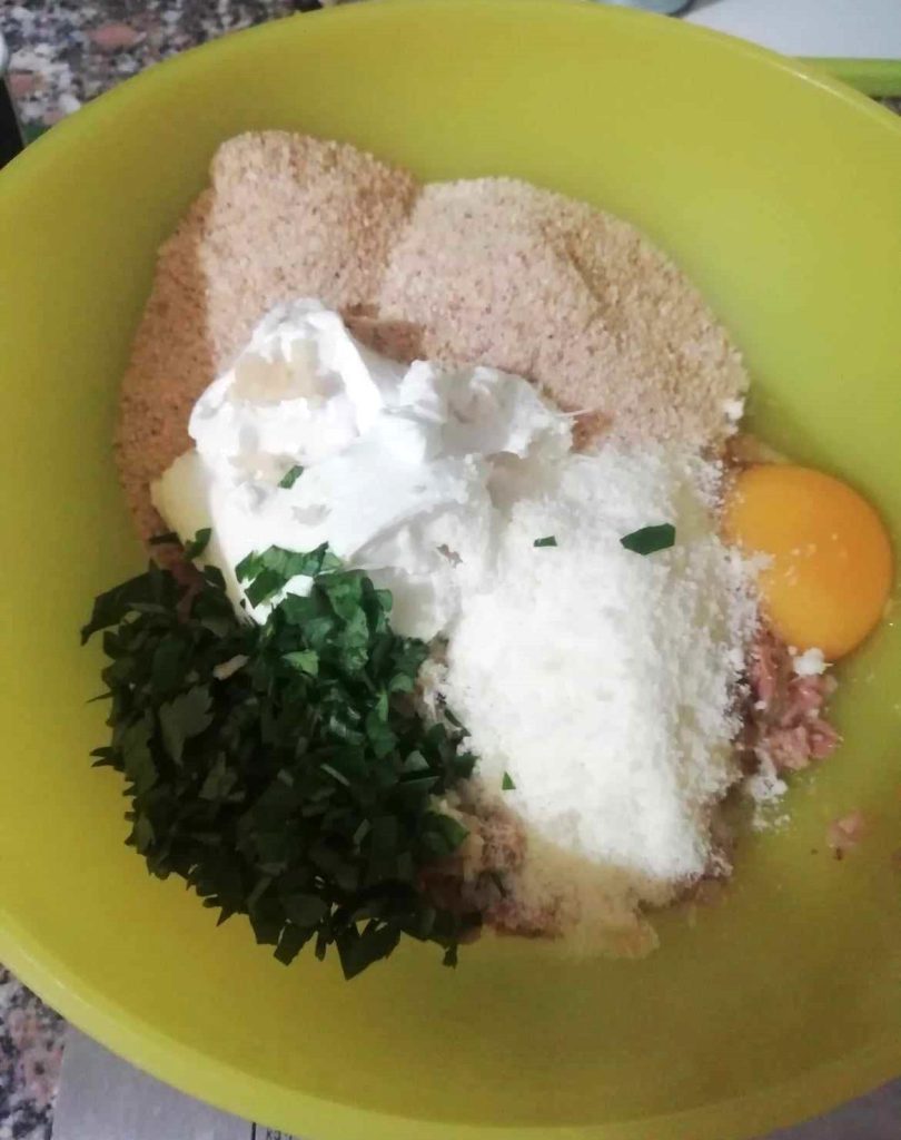 In a bowl, put all the ingredients, and with a fork mix them together, until you get a homogeneous mixture, neither sticky nor too firm. If necessary, add small amounts of breadcrumbs to give body to the mixture. Let it rest for 5 minutes.