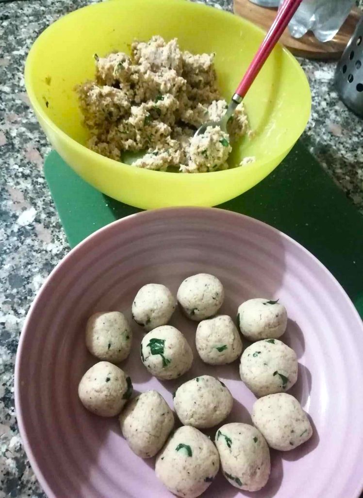 Using a teaspoon, scoop portions of the mixture and form the tuna meatballs, you will get 30 of this size, but I do not recommend making them larger, this size is optimal for the air fryer.