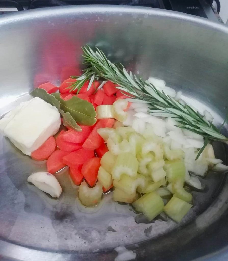 In the same pot where you cooked the roast, put 1.5 tbsp of butter and 3 tbsp of olive oil, 1 sprig of rosemary, and 1 garlic clove.