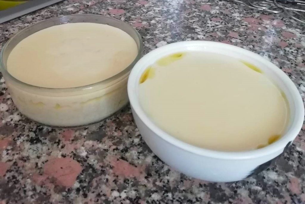 At this point, turn off the heat and transfer the mixture into a previously oiled container, or two small bowls, and let it cool down.