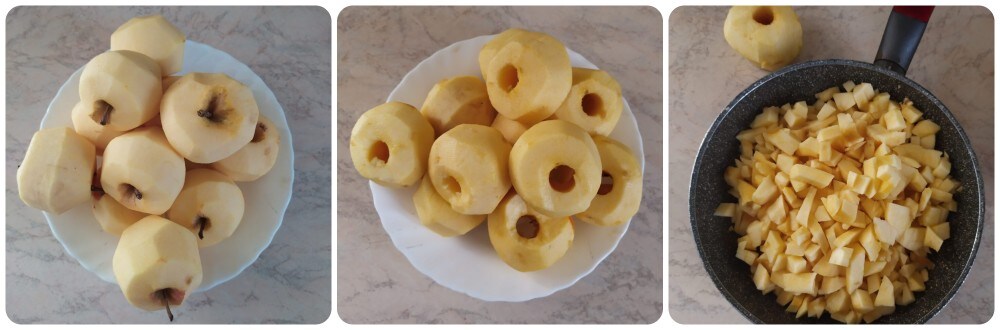 1) Wash, peel the apples, and dice them. Peel the garlic and remove the inner sprout. You can use Annurca, Golden, Fuji apples; they all work great.