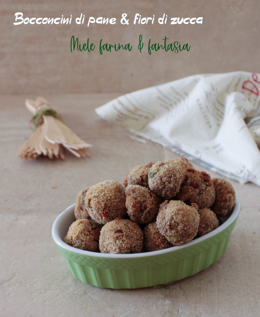 With zucchini blossoms you can make many tasty and clever recipes. Today I prepared these tempting and very easy egg-free bread bites. Perfect also as finger-food appetizers, the bread bites with zucchini blossoms are a zero-waste recipe: they come in handy for using up stale bread in a tasty and practical way. Make them to accompany aperitifs or a Saturday night dinner. They are delicious on their own or with sauces and creams on the side. Whether you call them bread balls or bites, the important thing is that they are soft inside, tasty, fun, and can be eaten in one bite.
