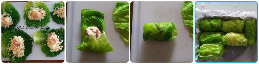 When the water boils, add the cabbage leaves and blanch them for 4-5 minutes max; drain them and immediately pass them in cold water and salt. Let them sit for a couple of minutes, then drain and lay them on a towel to dry the excess moisture.
