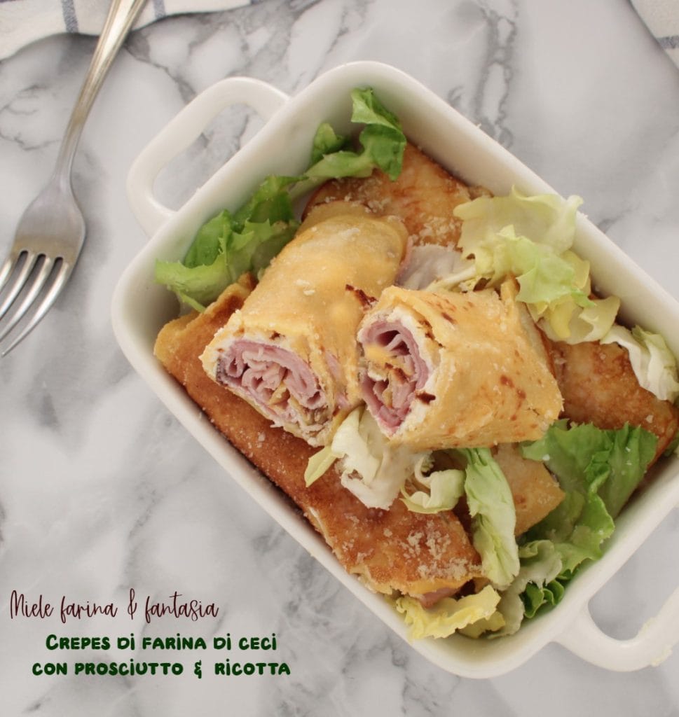 Chickpea flour crepes with ricotta and ham are delicious cannelloni made with filled crepes, very easy, perfect as an appetizer or even as a main dish. This recipe contains neither gluten nor eggs and, in my case, not even lactose, but it can also be enjoyed by those who do not have any issues with these foods. After being filled, the chickpea flour crepes with ham and ricotta are gratinated for a few minutes in the oven to obtain a delicious crust on top from the grated cheese, a real treat that will make your mouth water.