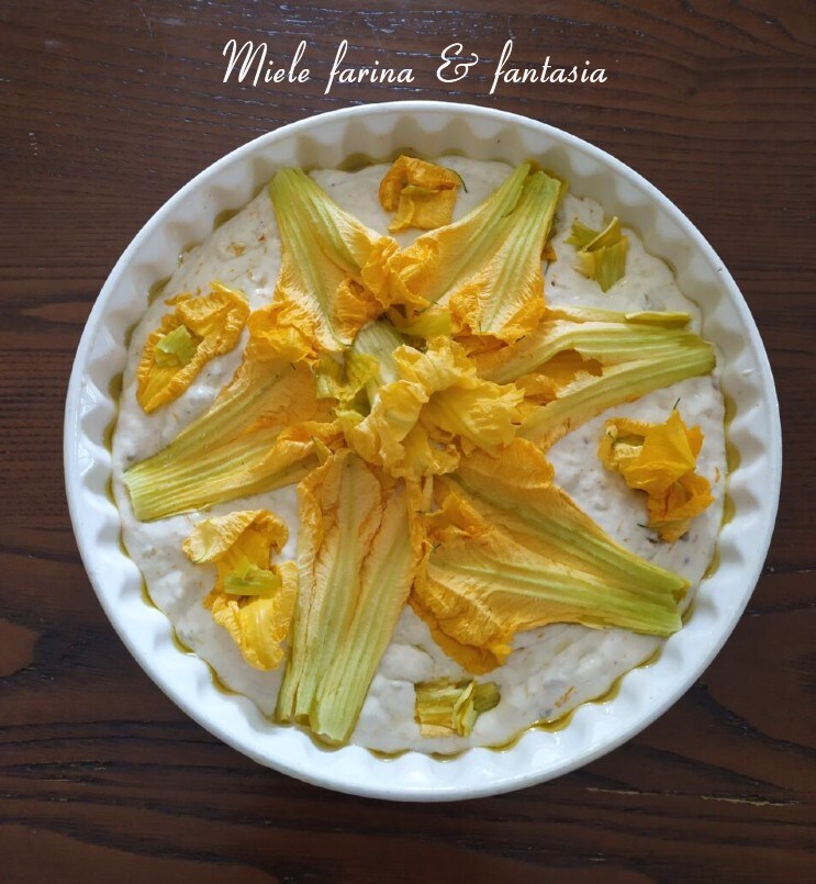 The focaccia with zucchini blossoms is a fragrant, very soft and tasty leavened bread. It’s a different way to enjoy these flavorful blossoms, which will absorb the seasoning and aroma of the other ingredients. With long fermentation, we will obtain an extraordinary focaccia, very digestible, well-aerated, with an aroma and softness that will last even the next day. The focaccia with zucchini blossoms can be filled with vegetables, cold cuts, or cheeses, making it suitable for buffets, aperitifs, or picnics. It’s a great beach snack or a work lunch. It can be made with both natural yeast and baker’s yeast. The thickness, we decide; in fact, if we want it thinner, it will be enough to use a slightly larger baking tray than the one I indicated.