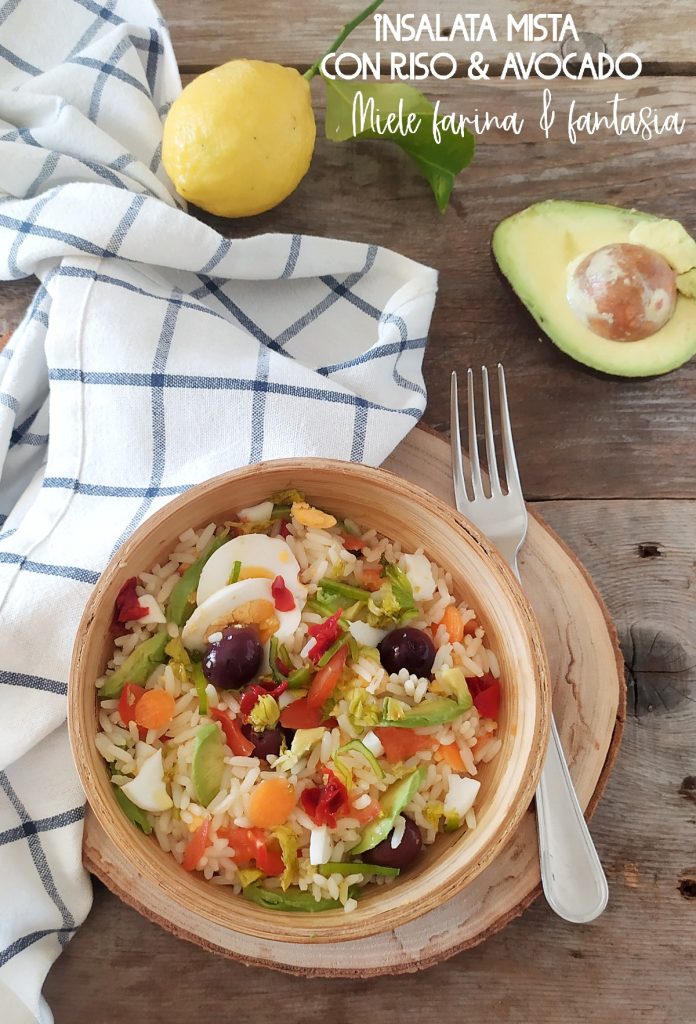 The season for cold pasta and rice salads is back — perfect to dress, enrich and personalise with what we like or already have at home. This kind of preparation is ideal when you have leftover ingredients from previous recipes that you can give a new life to without wasting anything. Today I prepared this mixed salad based on rice and avocado, to which I added hard-boiled eggs, olives and more. It’s vegetarian, hearty, very tasty, great to take in your packed lunch for work or leisure. It contains no gluten, lactose or milk derivatives and it’s simply delicious.