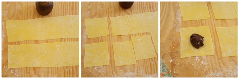 Thoroughly flour a work table, turn out the dough and roll it with a rolling pin until it is as thin as a sheet of paper, creating a rectangular sheet. Divide the sheet into two strips and then into squares, as in the photos below.