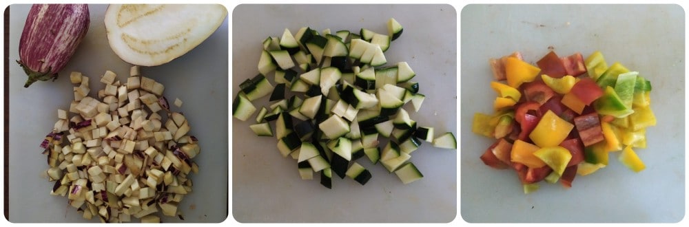 3- Separately, cut the peppers into strips and then into not too small squares; cut the eggplants and zucchini into large cubes.