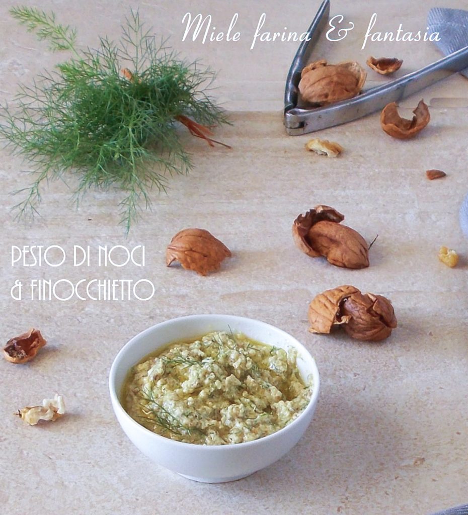 Wild fennel and walnut pesto is a very light, aromatic, and fresh-tasting condiment that can be prepared in a few minutes with few ingredients and without having to turn on the stove. It contains no gluten or milk and derivatives; it is, in fact, a completely vegetarian preparation. We can use it to dress or fill pasta or rice salads, sandwiches; or to accompany fried, boiled, or grilled meat and fish recipes.