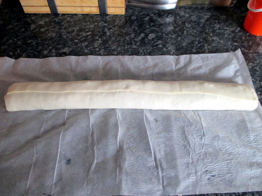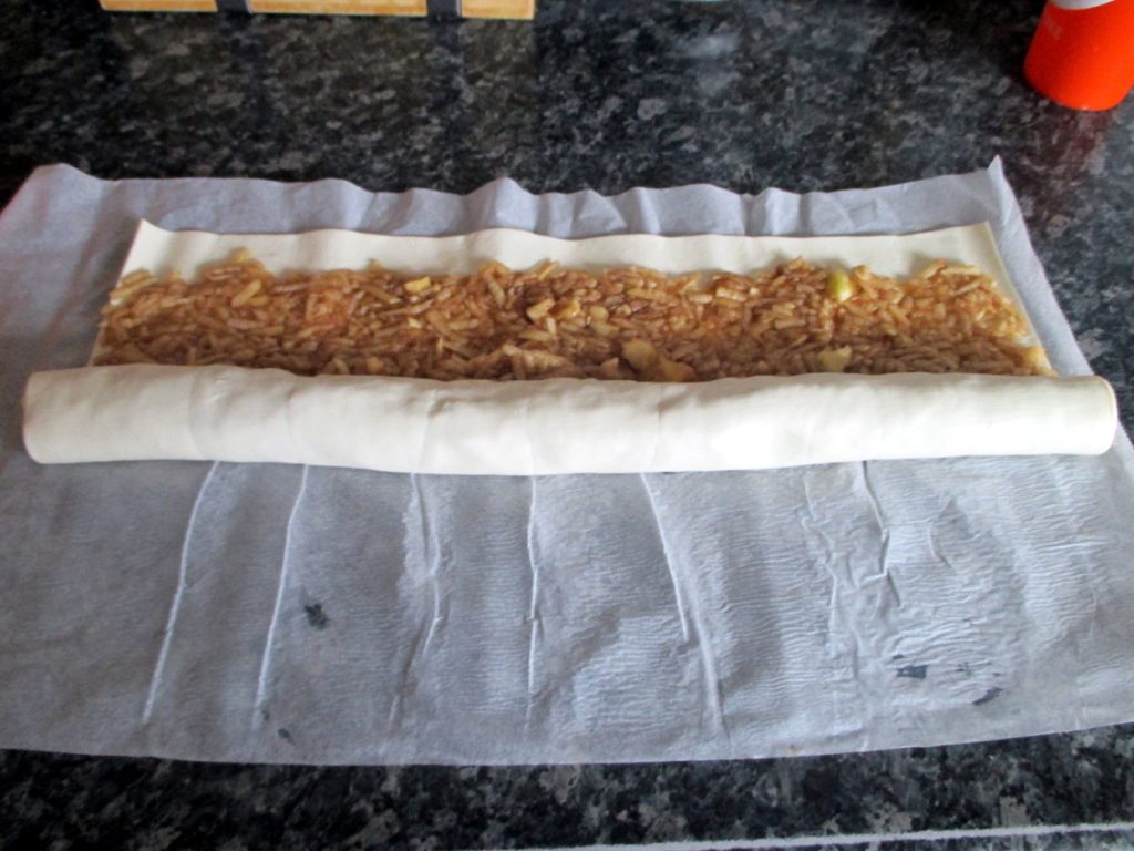 Start rolling the pastry from the long side, trying to create a roll that is uniformly “chubby” along the entire length and tightly packed, without leaving gaps inside.