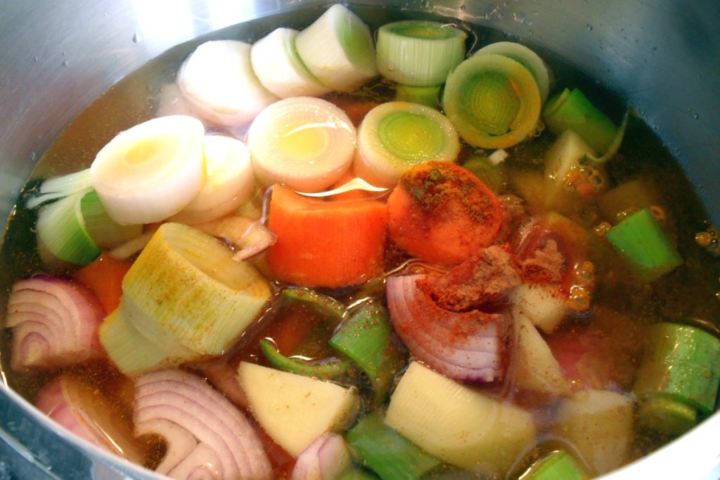 • Bring to a boil, then lower the heat to a minimum, cover, and let it simmer for about 40 minutes or an hour, until the vegetables are well cooked.
