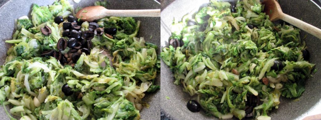 Prepare the other ingredients: slice the garlic, halve the olives, rinse and squeeze the capers well, and toast the pine nuts for a minute in a pan. The escarole leaves can be left whole or, once they’re cool enough, you can cut them into pieces. This is especially useful when the escarole is used to stuff savory pies.