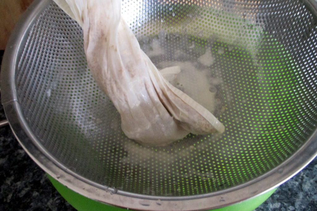 • Remove the bag and pour a little more water into the sieve — the bottom will contain the creamiest part of the milk which you should of course recover. You can help yourself with a silicone spatula.