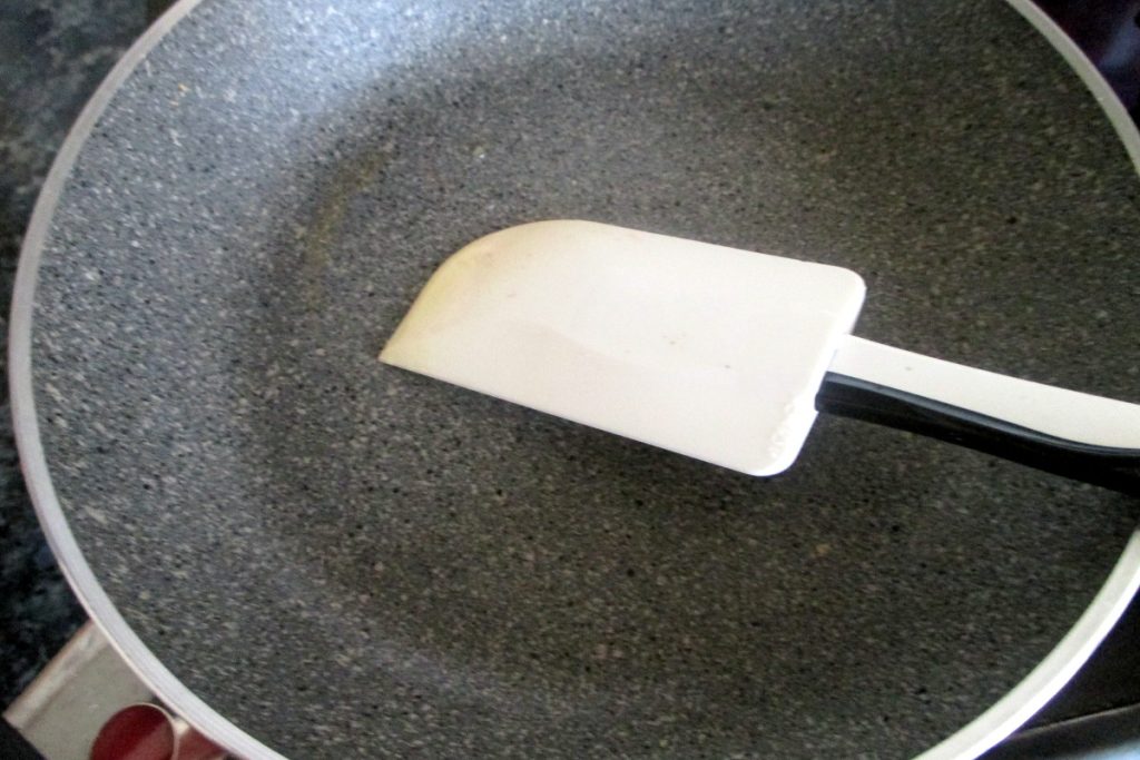 Using the same spatula you’ll use for cooking, spread the oil in the center of the pan.