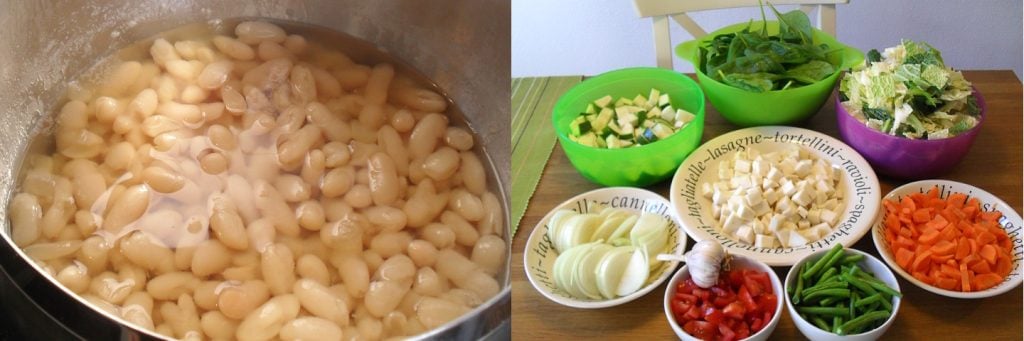 The ingredients I use are typical for minestrone; I often use all the leftover vegetables in the fridge. Or I buy a lot of zero-point vegetables and prepare frozen minestrone bags ready to cook. So onion, carrot, zucchini, green beans, cabbage, or others, depending on the season.