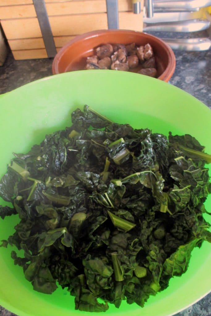 Clean the kale well by removing the central rib, cut it into pieces, and boil it for about ten minutes in a little salted water: it should be tender. Drain and set aside.