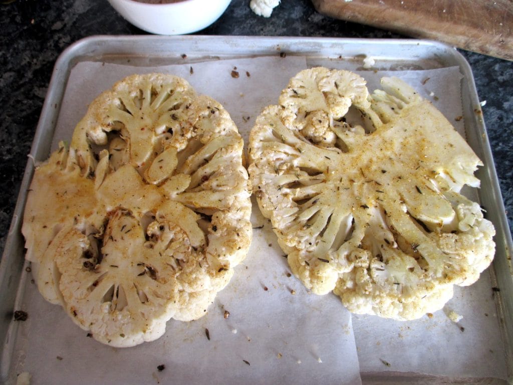 The most challenging part of this recipe is cutting the central part of the cauliflower into even slices, leaving ends that can be used for other dishes or simply frozen and added to soups later.
