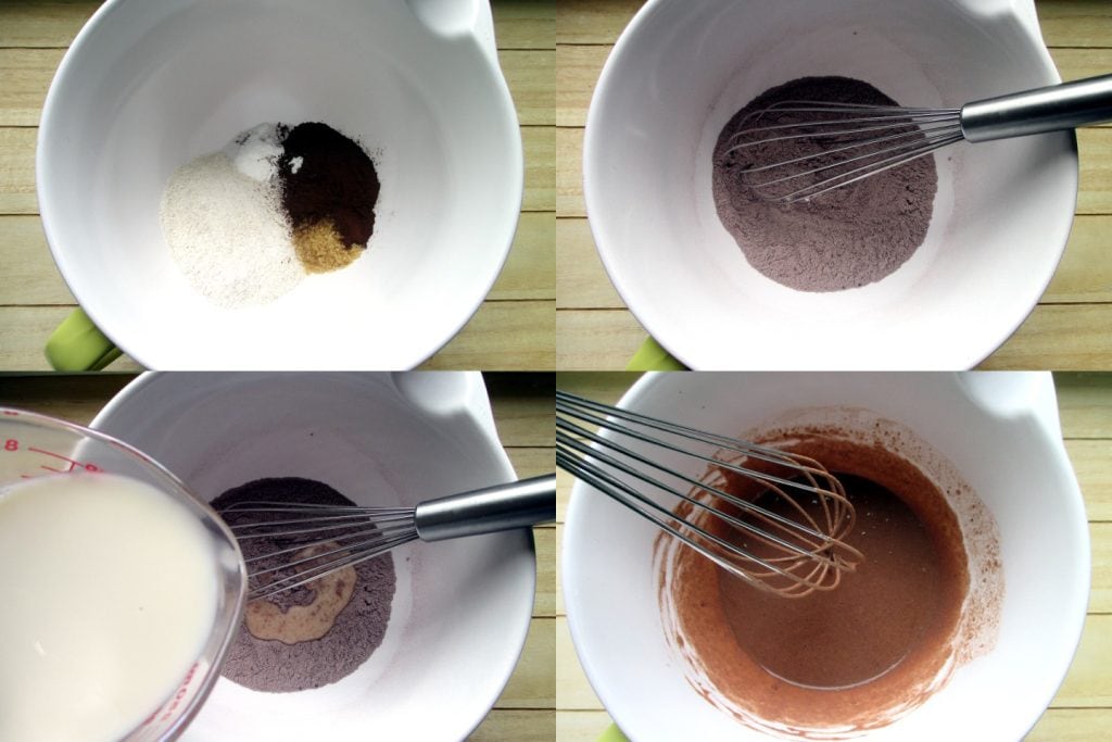 • In a bowl, mix all dry ingredients with a whisk: flour, baking powder, cocoa, salt, and sugar to break up any lumps of cocoa. Pour the almond milk slowly while mixing with the whisk to obtain a smooth batter.