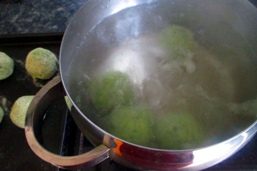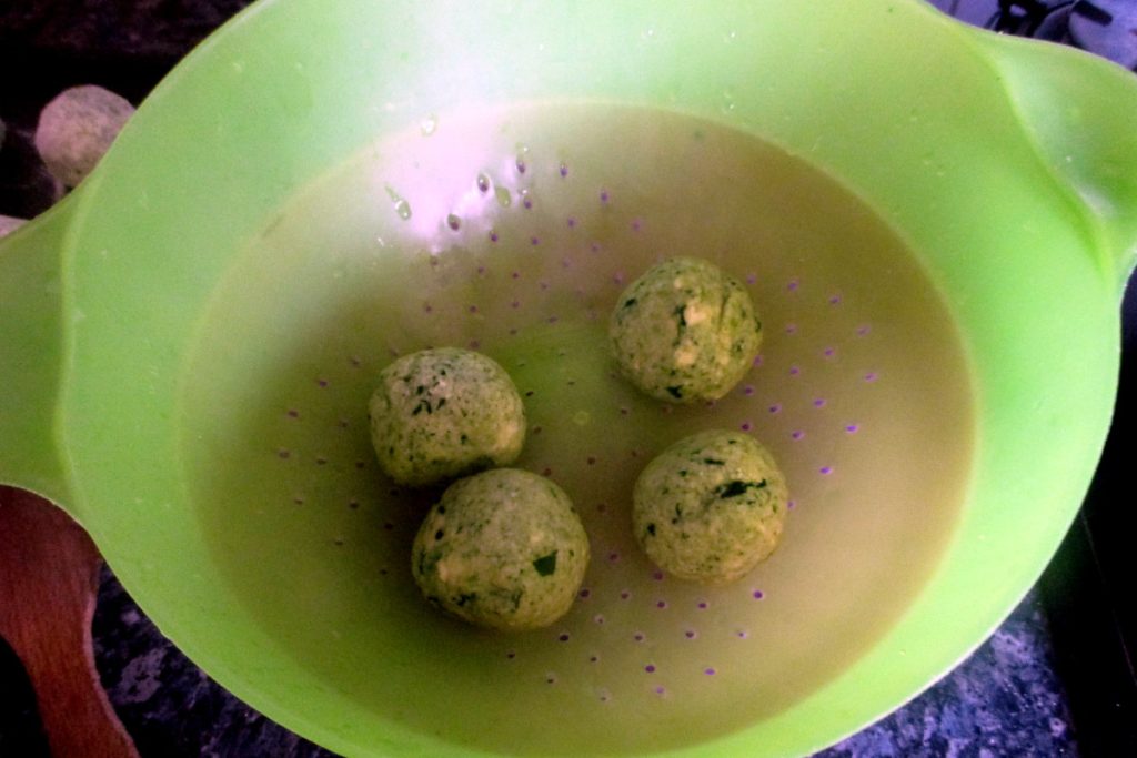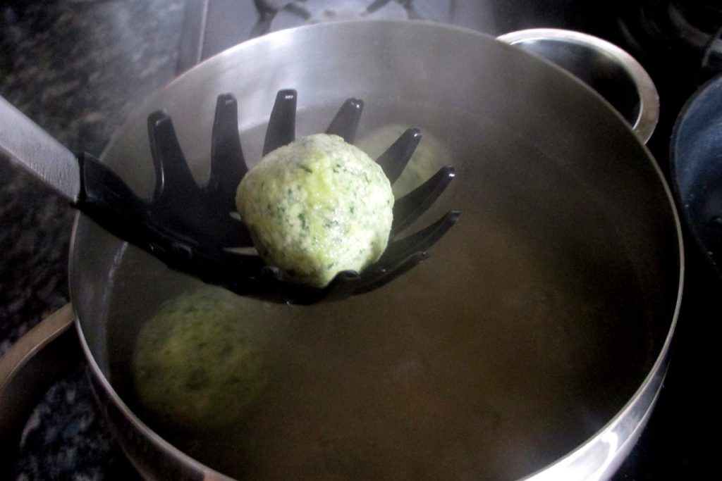 Bring the water to a boil with a bit of salt in a large pot. Pour the gnudi a few at a time; for 14 gnudi, I recommend cooking them in 2 batches.