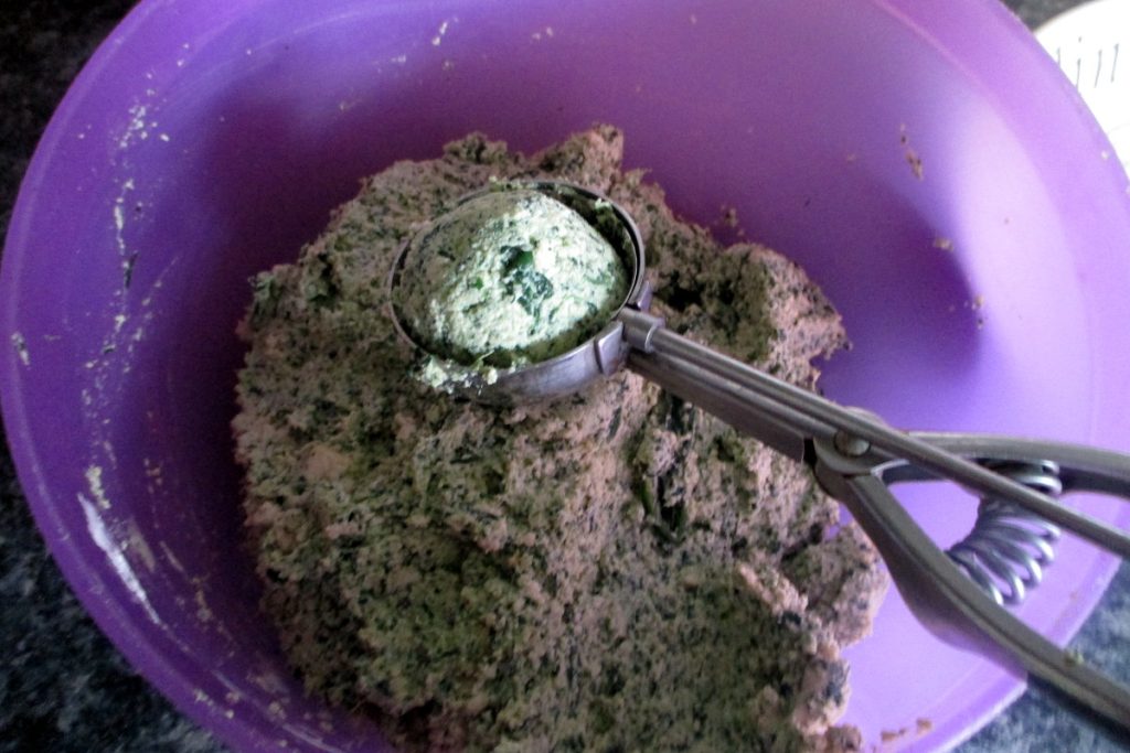 Using a large ice cream scoop (diameter 2 inches), scoop the mixture and roll it between the palms of your hands just like making a meatball.