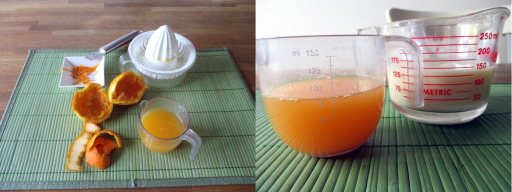 • First, thoroughly wash the orange, cut some pieces from the peel making sure not to take the white part which is bitter, and cut strips from the rest of the peel with the appropriate tool: these are to be set aside as decoration. Cut the orange in half and squeeze it. Measure the juice obtained and then measure the soy milk to make a total of about 1 cup of liquid. In my case, I got about 1/3 cup of juice and so I used 2/3 cup of soy milk.