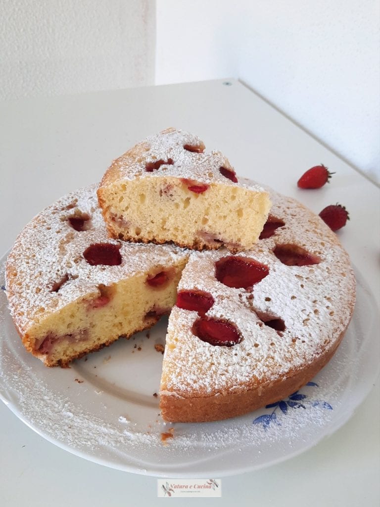 Butter and flour a 20 cm (8 inches) round cake pan. Pour half of the mixture inside. Take the strawberries, previously washed, remove the stems, and cut them in half lengthwise. Arrange only some of the strawberries on the mixture. Then cover with the remaining batter, and on top, arrange the remaining strawberries with the cut side facing up.
